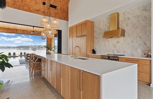 This home is a luxurious lakeside retreat accommodating up to 10 guests in 3 bedrooms and a bunk loft. With 270 feet of pristine lakefront, guests can enjoy panoramic views through grand 10' x 32' doors. Outdoors, you'll be greeted by an al fresco kitchen, elegant dining terrace, saltwater pool, and a ping pong table. Indoors, a spacious kitchen island and contemporary décor will provide comfort.