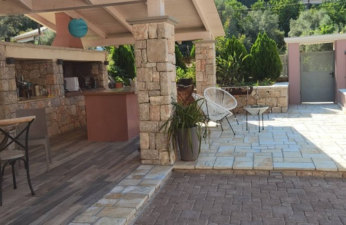 Calm stylish apartment with great outdoor space in nature! The yard is surrounded by stone and lawn, there is a parking lot, as well as a barbecue for relaxing evenings with friends.. At 150 meters there is a supermarket and a bakery.. And at 6 minutes is Desimi beach.. The cosmopolitan Nydri is 2 kilometers from the accommodation. .. Ideal for a peaceful holiday!!