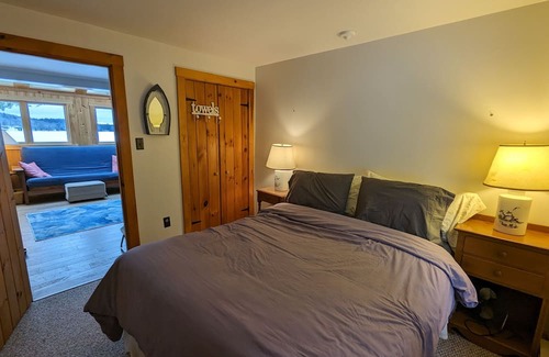 King bedroom on the second floor also has windows overlooking the lake & sunrise, but is equipped with blackout curtains if you'd rather sleep in. Desk space available in the king bedroom for working remotely. Queen bedroom is on the first floor off the living room. Wifi throughout.