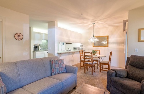 The Sweetbriar Garden Unit 2 Condo boasts a convenient first-floor location. An open floorplan makes it easy to relax and unwind in the evenings, and the soft carpet underfoot adds a touch of comfort. The cozy living room offers ample seating for conversation, including an overstuffed couch and two accent chairs, perfect for warming up by the fireplace or for enjoying a movie on the flat-screen TV. Enjoy life on the lake with partial water views from the living room. A pass-through window to the kitchen allows for easy conversation during meal preparation. The fully equipped kitchen features white cabinets, tile countertops, and everything you'll need to prepare and enjoy meals together. Enjoy views through the sliding glass doors as you dine at the round glass table, or step out onto the deck to sip your morning coffee or to do a bit of reading on the outdoor furniture.
