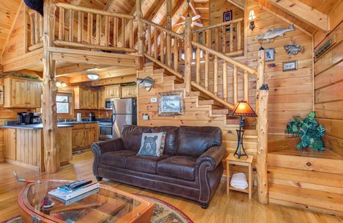 The cabin's interior is a blend of mountain charm and modern sophistication, with large windows on both ends bringing in plenty of natural light. The living room features a stacked stone fireplace, comfortable chairs, and a wide screen TV mounted above the mantel with internet. The well equipped kitchen takes the stress out of driving to dinner, while the dining room has the beautiful log wood table by a bay window. The wrap-around porch provides many opportunities for relaxation, whether you bring your coffee out to the porch swing or soak in the private hot tub as the starts come out each night. In the evenings, head upstairs to find a pool table and a multiple arcade game table in the sleeping loft with built-in-bunk beds. The main bedroom has a king size bed with a Roku TV mounted on the wall. In the living room you have a queen sleeper sofa.