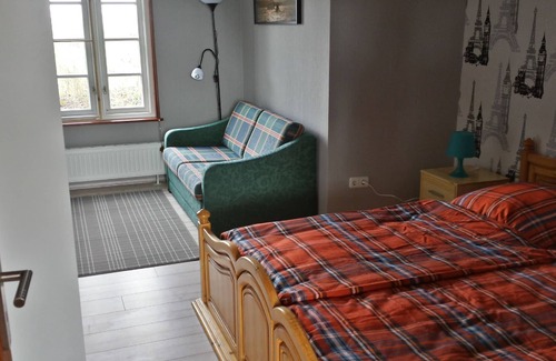 Enjoy your holiday in our very spacious 120sqm large ground floor holiday home. Experience the fantastic view of the Baltic Sea fjord Schlei and the viking city of Schleswig. The spacious apartment was completely rebuilt in 2013, and will be rented for the first time in 2014. The unique location unfolds the charm of the apartment in every season. On the park-like grounds, you can freely unfold. For children there is a football field, a trampoline a pirate ship and much more. If you spend your holiday with us with your four-legged friends, you will be taken care of and the leash can almost be left at home. The property is surrounded on three sides by fields. They enter the property through their carport and thus there is no adjacent street. In the back of the property is our 70 square meter forest hut. Here you can deal with not so good weather with billiards, darts or a movie night (projector, screen and PS3).