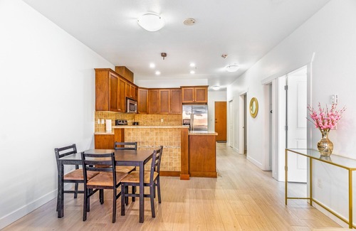 Discover comfort and convenience at our 1-bedroom and 2 bathrooms suite at this centrally located place, just 2 blocks away from Surrey Central. The place features a well-appointed bedroom, a fully stocked kitchen for all your cooking needs, and a living room with a smart TV.