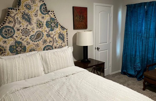 This is a 4 bedroom house that include 1 suite( bedroom, tv, fridge and toilet), a full furnished kitchen, living room and a lot of parking spaces. The house also has AC to cool down the Texas heat and a fenced backyard space