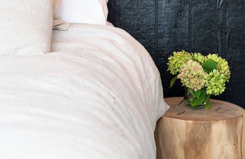 A stacker sliding door opens to the deck with its table for two, Matador barbecue and luxurious outdoor stone bath, and then step down to the firepit area with its natural log seating. It truly is heaven in the hills. The home is designed to be mindful of nature – it is solar powered and harvests rainwater, using filters to capture the purity of the water. We try to create a zero-waste system, reducing single-use plastic, while recycling were possible, to be kind to the surrounds and the planet’s future.
