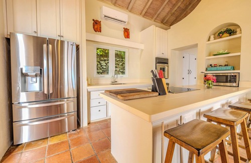 A graceful curved staircase leads from the pool deck to two equal air-conditioned bedroom/bath suites above, one offering a king bed and the other with two twin beds, a perfect layout for a couple with small children. Each bedroom opens out to its own covered patio overlooking the pool area and the tropical views beyond.