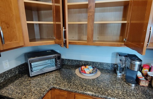 Fully equipped kitchen; Newest Keurig, Cuisinart Drip, Aero or French Press. Blender, crock pot, baking pans, pizza flipper, stainless cutlery, multiple wine bottle openers and selection of glasses, ceramic and plastic outdoor, and kid plates. Toaster Oven. If you have it at home, we probably have it here, and then some you may not have.