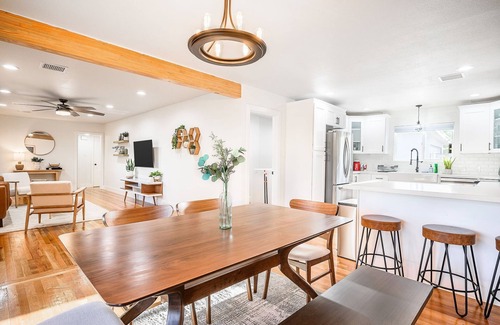 Welcome to your Vegas getaway! This stunning home in Las Vegas is your ideal retreat, situated just 10 minutes from the world-famous Las Vegas Strip, 10 minutes from the electric Fremont Street Experience, and a short 15 drive from the airport. Relax and jump into the sparkling pool (Note: pool is not heated). Enjoy a fully loaded kitchen, and a mid-century modern inspired living space that is sure to impress all of your family and friends.