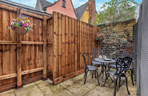 Enclosed courtyard garden with bistro-style table and chairs