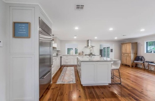 The entire house is packed with windows letting natural light hit the heart of pine floors at all hours of the day. The kitchen is loaded with premium finishes including a SubZero refrigerator and Wolf range. There are place settings for 8 people, pots and pans, basic cooking utensils, and a full size coffee maker. The kitchen opens up to the living area with ample seating around a Sony Smart TV. The dining room table seats 8.