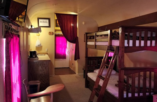 Railcar #3 — One queen bed and twin bunk beds in a single room