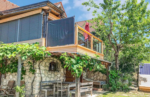 With a view of Riegersburg Castle, this very quietly located Kellerstöckl holiday home in the Styrian volcanic region welcomes you. Let yourself be enchanted by the view in a stylish, rustic ambience and look forward to relaxing in the sauna and cosy evenings by the tiled stove. Make yourself comfortable with a cup of tea in the conservatory and enjoy your time together.