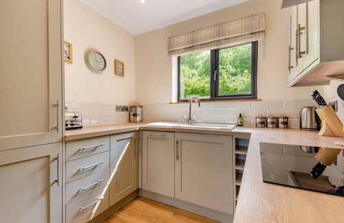 Once you’ve admired its impressive alpine-style appearance, step inside this delightful home to find a welcoming open-plan kitchen and living area. Cook up yummy holiday meals in the kitchen, perhaps with produce from Presteigne’s monthly farmers' market. On the ground floor, you’ll find a cosy double bedroom with an en-suite shower. The rooms boast lovely large windows allowing plenty of natural light in. Head up the wooden staircase to the first floor, where you’ll find a king-size bedroom with an en-suite bathroom, alongside an inviting twin room featuring its own en-suite shower.