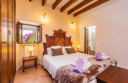 The rustic holiday home Sa Buhardilla is part of the agroturismo SES CASES D'ES RAFALET and is near the village Manacor in the east of Mallorca. The beautiful, rural villa consists of a living room, a well-equipped kitchen with a dishwasher, 3 bedrooms as well as 2 bathrooms (1 en-suite) and can therefore accommodate 6 people (4 adults & 2 children under 12). Additional amenities include Wi-Fi, air conditioning, fans and a washing machine. A baby bed and a highchair are available upon request. The large property features a shared garden with seating furniture as well as a child-proof communal pool where guests can cool off or just relax on the sun loungers with a refreshing drink. There is a small pool with a slide for children, as well as a small playground and table tennis. There is also both a covered and an open terrace where guests can enjoy the fresh air and beautiful mountain views, or cook a delicious meal outside on the shared grill. Despite the peaceful location of the finca, all the essentials are just a short drive away - a selection of shops and restaurants can be found less than 10 minutes away by car in Manacor (approx. 5 km). Many beautiful sandy beaches are also just a short drive away, such as the stunning Platja de Porto Cristo, just 23 minutes away by car (18.2 km). Palma de Mallorca and the international airport are a 43-minute drive away (51.1 km).