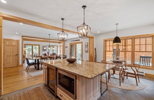 The heart of the (adult) home is the kitchen, dining, and great room. The kitchen is professionally equipped with a Wolf range, SubZero refrigerator, and beverage fridge along with a wide assortment of kitchenware that you will need to cook Thanksgiving dinner for 15 or a pre-ski breakfast for the whole family. The eat-in kitchen and island can accommodate 8 and the live-edge dining table can accommodate 8 more! The vaulted ceiling great room is framed by an 18-foot custom wood burning fireplace and chandelier to set the mood on those chilly Fall and Winter days. Relax with a cocktail or glass of wine around the fire while the kids play in the basement.