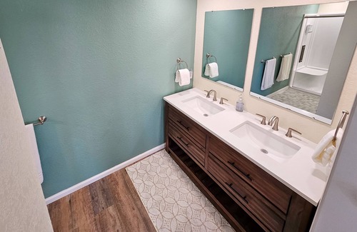 The home includes a shared bathroom with a full shower/tub combination, a bright vanity with storage, and fresh towels for convenience. The en-suite in the primary bedroom features a dual vanity and a walk-in shower with glass doors.