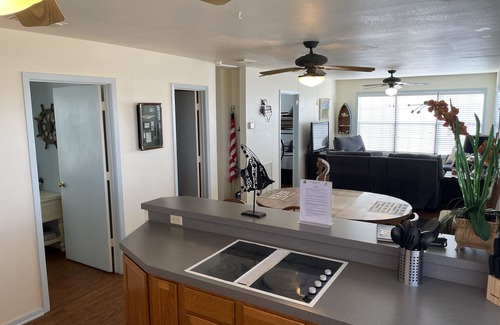 Awesome views from a comfortable two bedroom house that sleeps 7 . Lighted private pier just above the Caney Creek "Y" with excellent fishing. Less than 1 minute to Intracoastal Waterway, and 5 minutes to East Matagorda Bay by boat. Enjoy seeing most of Texas' water birds right from your own deck. This is a guest favorite with fishing families returning time and again. Master bedroom has a queen bed , 2nd bedroom has a pyramid bunk and a queen sized bed. Half Bath access from Living room. Full bath down hallway.