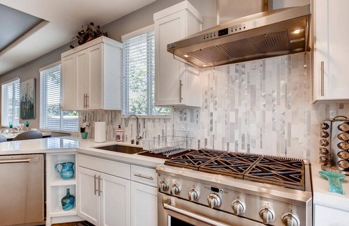 Contemporarily designed single story home done in grays and blue as an accent color. Gourmet kitchen features GE Monogram appliances. Both bathrooms have shower panels with massaging jets, spray hose and waterfall shower head. White quartz countertops throughout. Custom backsplash throughout. Fireplace and wine fridge in living room. Ceiling fans in every room. Five Smart TV's allow you to watch from every room. Brand new Wood laminate flooring throughout. White wood blinds in every window. Central A/C and heating. Backyard with seating area and outdoor dining table as well. New bedding and linens. Kitchen complete with dishes, glasses and all cooking utensils. Monday night is trash night. Please put cans out and bring them in on Tuesday. Cans must remain out of sight per the local HOAs.