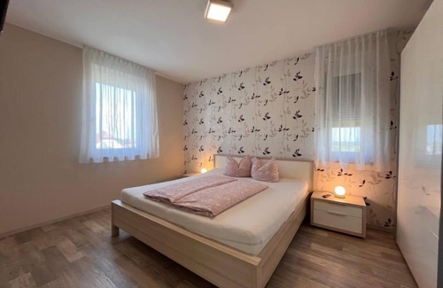 Modern, beautiful apartment block "Fuchs", built in 2015, surrounded by meadows and fields. 4 apartments in the property. 300 m from the centre of Donnerskirchen, 14 km from the centre of Eisenstadt, 66 km from the centre of Wien, in the residential district. Outdoor swimming pool 1.5 km. Golf course 2.2 km. Please note: animals in the neighbourhood. The photograph shows a typical example. Additional accommodations can be booked.