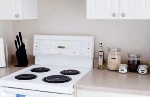 This unit is equipped with a full range of toiletries, including shampoo, conditioner, body soap, and hand soap. Each guest receives one hand towel and one body towel. Additional features include a hair dryer, q-tips, and cotton rounds. The full kitchen includes a stove, fridge, microwave, toaster, kettle, coffee machine, and French press. Cooking and serving ware, including children's plastic serving ware, are provided. Basic cooking ingredients such as salt, pepper, sugar, and canola oil, as well as basic breakfast items like oatmeal, coffee, coffee whitener, and tea, are also included. The building offers a shared coin laundry room, with $2 per load for the washer and $2 per load for the dryer.