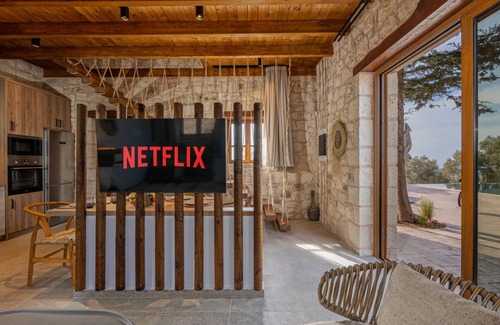The living room, as the rest of the Villa, is decorated in a boho, yet rustic style and it features a 50 smart TV with Netflix, A/C, comfy seating area with a sofa, armchair and coffee table and an open fireplace. A bluetooth speaker and board games are also available for stay-in nights.