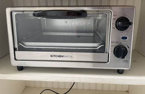 1) Electric water kettle, coffee filters, single cup drip coffee, toaster oven, two burner electric hotplate, silverware, dish-ware for two, minimal pots and pan provided, salt and pepper, oil and vinegar.
