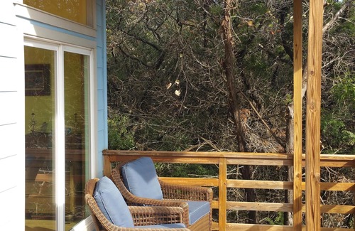 Quiet and romantic upstairs cottage in the treetops with hot tub, four poster bed with sumptuous sheets and a garden of flowers. Sit on the upstairs deck looking over the Wimberley valley and garden, grill some steaks and relax in little piece of Texas just for you. Then head for the hot-tub to watch the stars overhead.