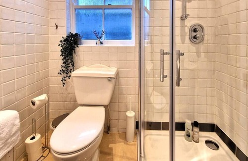 Venture down the hallway to find the first spacious double bedroom adorned with fitted wardrobes, offering views of the rear patio. Adjacent is the fully tiled bathroom, complete with a shower and toilet. The rear of the property unveils a second double bedroom with patio doors opening onto a peaceful outdoor patio—an urban oasis in the heart of the city.