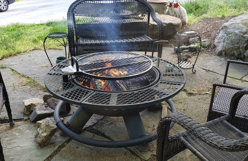 Once you step outside the house, nature awaits. Steps from the back door is a rock patio with a built in pond – home to three Koi fish, frogs and dragon flies. In the cabinet on the screened in porch there is fish food if you’d like to toss some pellets in. (no more than ten/day please) Beside the pond is a large firepit and seating area for you to enjoy. Hot dog roasting or smore making are highly encouraged. Perhaps sitting still and looking at nature isn’t your thing? If so, the front yard is spacious enough to play ball or just run around and take turns on the tire swing. The area around and beside the garage is fully-fenced so you can let your dogs wander in a controlled area to do their business. In front of the garage we have a basketball hoop and you’re welcome to adjust it as necessary and play.