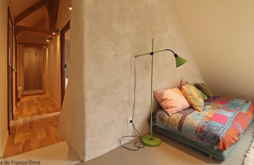 Independent house with electric and wood heating, all-inclusive package. Ground floor : Large entrance with wardrobe and toilet, Living room with kitchen and open fireplace (1 basket of wood provided), Living room with wood stove and connected speaker (TV and wi-fi currently being installed). Attic floor: landing with extra bed for 2 people and library, bedroom (double bed 160 x 200 cm), bedroom (double bed 140 x 200 cm) with bathroom, small bedroom (2 trundle bed for 1 person 90 x 200 cm), independent shower room (shower <1.90m) and second room with sink and toilet. Laundry room with washing machine and dryer. Possibility of additional bed: €15 + €10 breakfast. Enclosed garden with trees. Badminton court under the barn currently being installed. Electric car charging point on site. L'Anglaicherie is a centuries-old Percheron farmhouse renovated with authentic, natural and healthy materials. A touch of modernity brings comfort and light thanks to the large bay window overlooking the garden. The rooms on the ground floor are very spacious. Your hosts will offer you the first breakfast of your stay, 100% organic and local. You can taste eggs from their chickens and honey from the hives on the property. Isabelle offers relaxation and Qi Gong sessions. She also devotes herself to oil painting and provides a place for creativity and relaxation adjoining the gite (150 €/day or 180 € with the 10 meditation mats and zafous). Possibility of guest rooms for 8 people (1 bedroom on the ground floor with non-adjoining bathroom at €70 per night and 3 bedrooms with bathroom upstairs at €170 per night) with the owner nearby and in the hamlet. The price does not include: €10 for an additional basket of wood. €15 for an additional rollaway bed €10 for additional breakfast €150 for the day or evening rental of the workshop or €180 with the 10 meditation mats and zafous Enclosed grounds, Fireplace, Washing machine, Dishwasher, Baby welcome, Heating included, Sheets included, Tumble dryer, Stove, Barbecue, Garden furniture, Freezer, Housekeeping included, Linen included, Garden, Electric vehicle charging, mail ok , PlanPart, Individual House. Property managed by a professional. Unless stated, services such as cleaning, bed linen, towels etc. are not included in the price of this rental. If pets are allowed (information in the advertisement), charges may be applicable. Only equipment mentioned in this advertisement are present. Equipment not mentioned are not considered to be present.