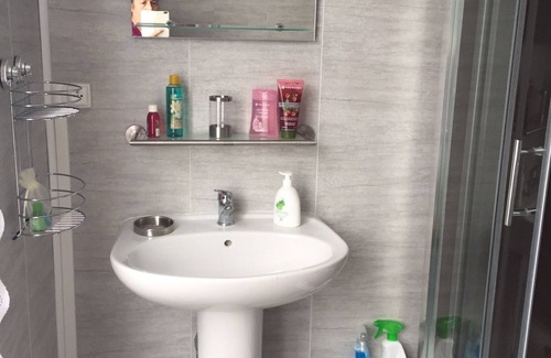 2 bedrooms with 2 single beds and a bedroom with 1 double bed, an independent toilet, a bathroom with sink and shower, washing machine