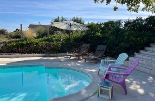 Settle into this cottage with a view where you can relax, swim in our salt pool (unheated), to share with us, size 9m x 4m, depth 0.70m to 1.80m, covered by a dome in case of cold wind or even rain. You can relax on one of the deckchairs by the pool, in the sun or in the shade or sit under the tree in the morning, have breakfast, enjoy the view of the fields, and, in the afternoon, settle into comfortable armchairs under the parasol.