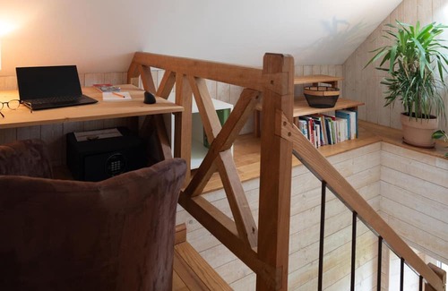 Wooden frame house adjoining a dwelling. On the garden level, entrance, bedroom 1 (140x190 bed), bathroom (washing machine), separate toilet. On the 1st floor, living room with open kitchen (oven, gas hob, microwave, refrigerator, freezer, espresso machine, dishwasher), lounge with wood stove (TV, internet). On the 2nd floor, office area and bedroom 2 with bathroom area and toilet integrated into the bedroom (200x200 bed). Baby equipment on request. Bed sheets and towels included. Beds made on arrival. Cleaning service extra. Gas central heating. All charges included. Raised wooden terrace linked to the living room (covered part). Garden Lounge. Deckchairs. Pellet barbecue. Common enclosed land. Unfenced private garden. Children's cabin. Car park. Adult electric bikes, with provision contract, on request. Non-smoking gîte. This old farmhouse has been completely rehabilitated into two separate dwellings. The previous owner, very skilled in woodworking, achieved feats by playing with medieval codes and integrating corbels or mullions...Claude fell under the spell of this unusual place and took up residence there, enjoying the comfort of the woods and all surrounding amenities. Having set off on the roads of France by bike for a long human adventure, he is happy to share his little paradise with you in his absence. It's Céline, the neighbor, who will show you this unique residence and its living rooms upstairs extended by the raised terrace... in wood of course! It overlooks the meadow opposite where some farmyard animals reside. The large master bedroom on the 2nd floor with its built-in bathtub is remarkable! In Claude's wake, you can also cycle at your leisure on the greenway 500m away and why not reach Mont St-Michel... to each their own challenge!