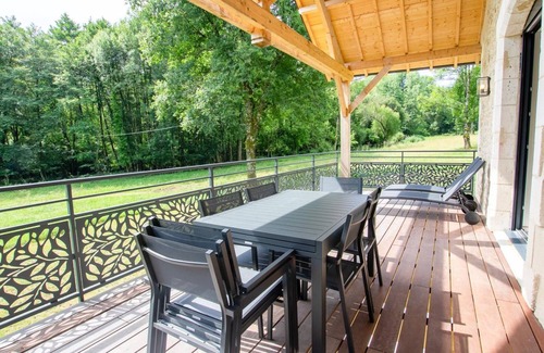From the private car park, access the living room with a fully equipped modern kitchen, a comfortable living room opening onto a suspended wooden terrace. A separate toilet. Relax while enjoying the 2 terraces with views of the countryside and the owner's private pond. You will be lulled by the gentle sound of the stream that passes below the land.