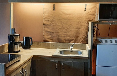 "Glampingtent Country 6", 4-room cottage 50 m2. Simple furnishings: living/dining room with dining table and TV. Exit to the terrace. 2 rooms, each room with 1 x 2 bunk beds. 1 room with 2 beds. Small, open kitchen (4 induction hot plates, kettle, electric coffee machine, combination microwave). Shower/WC. No heating option. Terrace. Terrace furniture. Facilities: Internet (WiFi, free). Please note: non-smokers only. This object is a glamping tent and can be entered via a few steps. A shared hot tub can be used on the field near the Glamping tent. Pets on request.