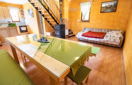 Holiday Home Blue Sky is a small village home located on the hill, surrounded by vineyards and forest. The apartment is recently renewed and refurnished in a traditional Slovenian style. Inside the house there is a big bedroom on the first floor with one king sized bed, one double bed, one single bed and additional sofa bed for two person. On the ground floor there is a fully equipped kitchen, which allows you to enjoy your own meals and holiday. There is also a living room with dinning area, sofa bed and a TV. From the terrace with a BBQ you can enjoy yourself by gazing at the mountain and hill view surrounded with vineyards.