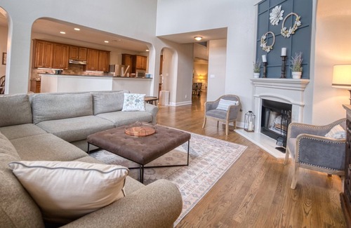 This house is 4,300+ square feet with plenty of space to spread out. On the first floor, there are wood floors throughout the common areas. Large kitchen with granite countertops, stainless steel appliances, and island with prep sink - making cooking a breeze. Open dining room with table that seats 8 (kitchen table seats 6 + additional seating outside). Home office with electric standing desk and 55" TV. Livingroom wall features windows with view of the pool and golf course. Comfortable and stylish sectional, wood burning fireplace and 65" TV. Half bathroom off the livingroom, mud room with washer and dryer, coat hooks and storage space plus second refrigerator. Main room and bath are also located on the first floor. The second floor offers a home theater with HD Projector and 5 leather recliners, gameroom featuring billiard table, ping-pong table, and dart board with kitchenette and bar seating, four bedrooms, two full bathrooms and a flex space.