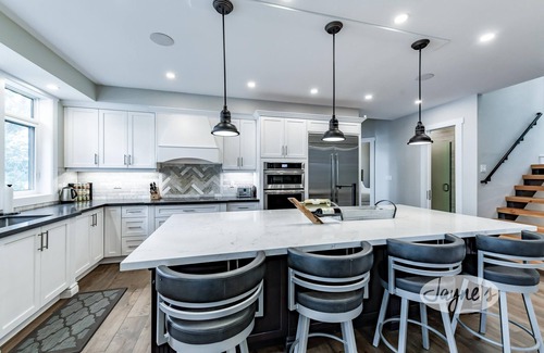 This beautiful property has 280ft of frontage which provides renters with both comfort and privacy! The open-concept main floor walks out onto a very spacious and sunlit deck, bordered by a glass railing and furnished with 2 lounge chairs, a couch and 2 club chairs. A naturally designed stone stairway lowers you down towards the waterfront. Halfway down the pathway sits a fire pit surrounded by 6 Muskoka chairs - perfect for roasting marshmallows or keeping warm during cool summer nights. Enjoy basking in the all-day-sun on 1 of the 6 Muskoka chairs on the dock. The dock also features one sea-doo slip and deep water off the end - perfect for diving. About 25 yards off the dock sits a floating swimming platform providing an amazing place to swim and enjoy the lake.