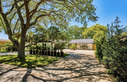 5500 Queenswood is a Florida classic. Quiet, safe and secure, and private. As you arrive, you'll first take notice of the convenient, extra large circular driveway with ample parking for multiple, large vehicles. The gorgeous, updated brick home featuring three bedrooms, two full bathrooms, is impeccably styled with both new and vintage collectible mid century furniture. The primary bedroom features and fully renovated bathroom and large, walk-in closet. The South wing can be privatized by way of the pocket door, closing off the secondary bedroom and full bathroom. The third bedroom is set up as a dual purpose, spacious office with large desk, high end desk chair, hdmi monitor, usb keyboard/mouse and a laser printer/scanner. This room/office also features a twin size sofa/daybed. Just off the kitchen is the large cozy living room with two full size sofas and a massive 85 inch smart TV. Enjoy the extras! a bonus room with billiard table and steel tip dart board, and a sprawling, covered back patio with full size dining table and plenty of comfy seating to enjoy the mature trees swaying in the breeze and the many species of birds flying overhead. The patio stoop descends on the extended living space backyard with marble rock bed for the large, shaded outdoor sectional sofa and fireplace. The tall fence and extra tall privacy screens create a warm feeling of total peace, security and privacy, while retaining the ability to enjoy the live mature tree canopy surrounding the home. 5500 Queenswood has recently undergone a complete renovation including the updated open floor-plan, brand new appliances in the chef's kitchen, new bathroom sinks, faucets, shower/bath, toilets. Every single light switch, power outlet receptacle, and fan has been updated as well as a brand new washing machine in the large garage. To make your stay as close to home as possible, the space also includes a full range of kitchen utensils, snap lid glass storage, and electric kitchen devices (toaster oven, food processor, slow cooker, rice maker). The star of the kitchen show is the high end espresso machine and coffee grinder. You will find the pantry stocked with plenty of paper towels, toilet paper, and cleaning products. The rental agreement includes weekly landscaping service and monthly cleaning service. The historic neighborhood of Kingswood Manor was built in the heyday of Mid Century America and offers a massive, sprawling, lakeside community park with the following amenities: Olympic Size Swimming Pool! A boat ramp to Lake Weston; full court Basketball Court; two Tennis Courts; and a soft-floor playground. Gated keycard access to the KMA park is included with the rental.