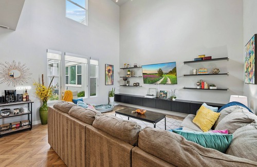 Sit-back and create memorable moments with family and friends, watch a movie on the Smart TV, or just relax, craft a cocktail, and listen to your favorite record. Colorful décor livens up the atmosphere in this unique space.