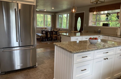 This river view house with 200 feet of Rogue River frontage is a great choice for family vacations. The 2,700 sq. ft. recently remodeled house is located on 2 acres at the end of a private drive, yet is minutes from downtown Grants Pass, a hospital, restaurants and a supermarket. It consists of a main house and an attached apartment and can host up to 8 people. All of the appliances, furniture, heating and air conditioning systems are new as of 2017 or 2018, and wireless internet and TV are provided. It is a perfect place for two families vacationing together while also having the privacy of separate units.