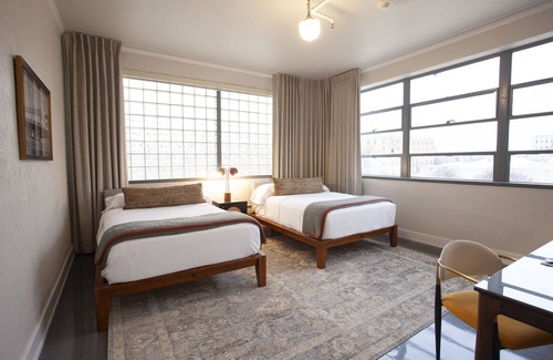Immerse yourself in history in this suite with curved glass block walls and metal windows. Natural light fills the space, accenting two double beds, freestanding tub, and separate shower. Kitchenette, living area, and second-floor stair access complete the experience.