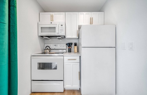 Step into the cozy living room, where you'll find a comfortable 2-person couch, a hanging chair for relaxation, and a 40'' Smart TV and high speed internet for your entertainment needs. The space is complemented by coffee tables, creating a warm and inviting atmosphere. The kitchen, seamlessly integrated into the living area, is fully stocked with modern amenities including a 4 range induction stove top, an oven, a 2-door fridge with a freezer, and a microwave. Whether you're whipping up a quick meal or preparing a gourmet feast, you'll find everything you need right at your fingertips.