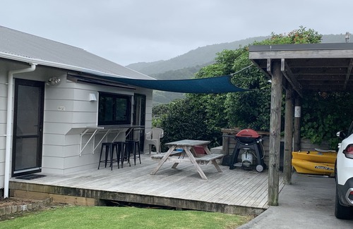 Located 33km from central Whangarei city, the property is unique because it offers such a diverse range of holiday options. If visitors just want to rest and relax, they can sit peacefully on the north-facing deck and watch the world go by. There is always something happening in the bay below or further up the harbour. From people going fishing and diving, windsurfers skimming across the waves, families swimming and people beachcombing. While the main shoreline of the beach is pebbley, and beach shoes are recommended, there are sandy beaches at each end. It is very safe and an ideal spot for youngsters to learn to kayak.