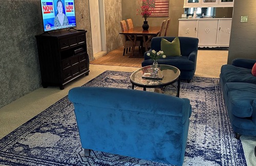 Our large, beautiful 2-story, 3-bedroom, 2-and-a-half bath home on “Heroes Boulevard” is the perfect retreat for you and your family. The home features 2 huge master suites with adjoining baths and a third bedroom - all with premium bedding, living area, a half bath, kitchen, separate breakfast and dining areas, washer and dryer and a beautiful park-like setting in the backyard with outdoor grill. Enjoy the huge soaking tub, plenty of room for the little ones to run around and free Wi-Fi.
