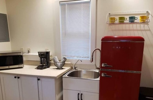 This was an office converted into a studio. Basic kitchen with microwave and fridge (think hotel rather than full kitchen). There is a cottage specific charcoal grill outside as well.