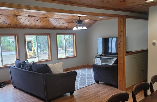 Escape to this delightful house in picturesque Gilford. This charming property features 4 bedrooms, including 2 king beds, 2 bunk bed, and 1 full bed. With 3 bathrooms offering amenities like a jetted bathtub and shower, guests will feel pampered during their stay. Our place will help you feel at home while you're traveling in Gilford. This 4BR 3 Full bath home will help you and your families create a lifetime of memories. The house sits across the street from the lake with incredible views. Centrally located to incredible hiking trails, Ellacoya state park, small private beach, walk to the Bank of NH Pavillion, access to a day dock and so much more. It comes with a side suite that has its own sitting area with sink, refrigerator, bedroom and bathroom. Enjoy the outdoor sitting area to read a book or make s'more's at the fire pit. Its a 10 minute ride to the famous Weirs Beach Boulevard to enjoy the restaurants, bars and shopping. You have a full functioning kitchen to eat in every meal with all the amenities of home. If you prefer to eat out you can walk to 3 of the area's best restaurants, The Breeze restaurant, Patrick's Pub, and Sawyers Ice cream or just a 4min drive. Access to a grill winter or summer. Plenty of room to spread out and relax. If skiing is in your wheelhouse, then this is the place to be. Gunstock Mountain is just minutes away, if skating is what you like to do then the Gilford public rink is a 5min walk away. `The location of this property has all 4 seasons covered, come and make your memories here.