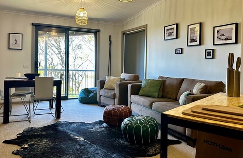 Higgi Drive 5 is a spacious one-bedroom, one-bathroom apartment at Mount Hotham, designed with families and skiers in mind. Located just meters from the Big D ski run, it offers convenient ski-in/ski-out access. The apartment features modern furnishings and includes a full kitchen equipped with an oven, microwave, dishwasher, and full-size fridge. Additional amenities comprise a washing machine, tumble dryer, electric panel heating, Wi-Fi, and a smart TV for streaming services. The bedroom offers a king-sized bed, which can be split into two single beds upon request, and the lounge area includes a sofa bed, accommodating up to four guests.
