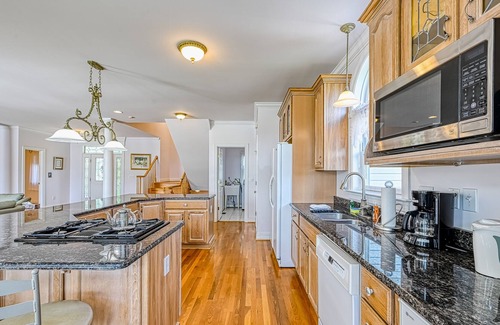 Reward yourself with the vacation you have always wanted when you stay at this beautiful home with endless high-end features! Anna's Oasis is a three-story lakefront home located on Lake Anna and offers a private boat dock outside the home that will accommodate up to a 30 ft. boat. As you have noticed from the photos, this darling home is all about outdoor living and entertainment. The stone patio in the back of the home greets guests with a built-in firepit and plenty of comfortable seating. There is high-end landscape lighting all around as well. Guests will also enjoy bocce ball, croquet, Kan Jam, and volleyball and soccer courts.