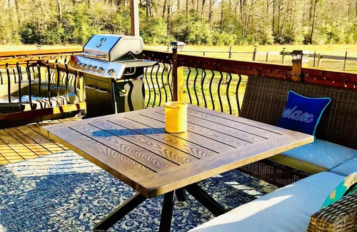 Waterfront - Ranch Setting, fenced yard for the dog. New RV , King bed is comfy!, couches make into 2 queens. Great fishing (bass, perch, catfish) fire pit, new porch, new grill, hot tub, new patio furniture, and Bluetooth radio. We can show you how to work everything if you have never stayed in an RV. All new smart TVs and fire place!